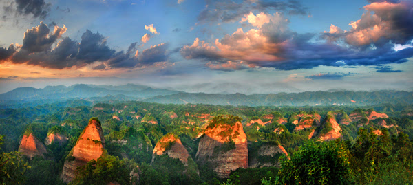 萬(wàn)佛山地處云貴高原向南嶺山地的過(guò)渡地帶。經(jīng)數(shù)以億年的流水、風(fēng)化地質(zhì)作用,逐漸發(fā)育呈現(xiàn)出丹霞赤壁、石嶺、石寨、石柱、石橋、一線天、狹谷、溝巷等奇特的丹霞地貌自然景觀。域內(nèi)丹霞峰林拔地而起,巍巍陣列,尤如一幅天然水墨長(zhǎng)卷。登臨萬(wàn)佛山主峰山頂,俯視峰林,氣勢(shì)磅礴,向西南可望海神龜活神活現(xiàn);向北望毛蠟燭峰、天書巖、夫妻巖形象逼真;向南可遠(yuǎn)眺將軍山主峰及該將軍山景區(qū)螺絲峰和神仙洞景區(qū)大寨巖主峰及神仙山主峰。群峰列陣,萬(wàn)佛朝宗,不愧為“丹霞群峰第一山”。