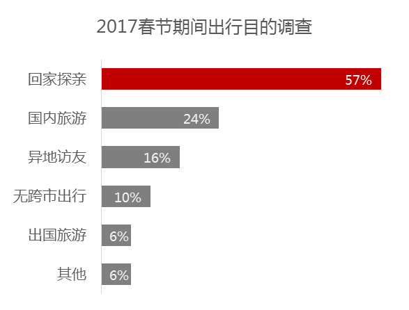《報告》關于2017年春節(jié)跨市出行(長途出行)意愿的在線問卷調(diào)查數(shù)據(jù)顯示,“回家探親”是受訪者春節(jié)期間長途出行的第一大動機,“國內(nèi)旅游”則是第二大出行動機。總體而言,受訪者能夠明確給出的春節(jié)出行動機中,除了“回家探親”,就是旅游(國內(nèi)游和出境游)。這表明,居民2017年春節(jié)期間的旅游消費意愿強烈,旅游過年已經(jīng)成為較為主流的過年方式。