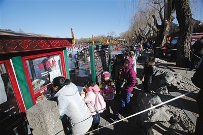 2月1日,北海冰場(chǎng)迎來客流高峰,售票處排起長隊(duì)。新京報(bào)記者 王飛 攝