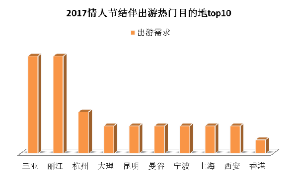 同程旅游對今年情人節(jié)當天情侶們及單身男女的旅游消費及出行數(shù)據(jù)進行了系統(tǒng)分析。《報告》數(shù)據(jù)顯示,情人節(jié)恰逢春節(jié)后錯峰出游的好機會,國內(nèi)旅游最受歡迎的目的地主要有三亞、廈門、桂林、昆明、麗江、上海、杭州、揚州、北海、成都等。出境游方面,日本、韓國、泰國、澳大利亞、新加坡等。