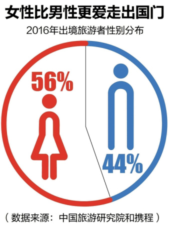 而在性別上,女性比男性更愛走出國門。中國旅游研究院和攜程的報告顯示,根據(jù)在線出境游的性別、年齡統(tǒng)計,2016年出境旅游者中,56%是女性,44%是男性,女性比例高12個百分點(diǎn)。