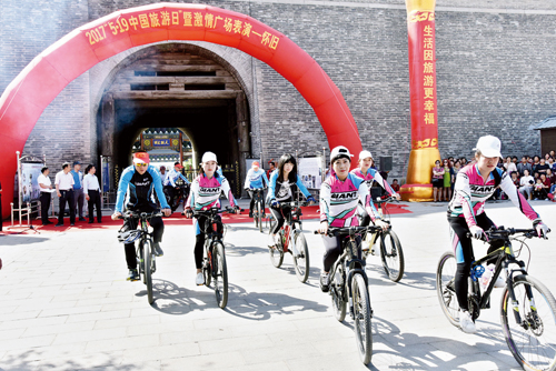 活動(dòng)中,旅行社代表發(fā)言,旅行社導(dǎo)游集體宣誓,旅行社負(fù)責(zé)人和導(dǎo)游集體簽署文明旅游承諾書。啟動(dòng)了捷安特騎行隊(duì)騎游??h文化藝術(shù)館舉辦了“激情廣場(chǎng)表演——懷舊專場(chǎng)”演出,節(jié)目有舞蹈、獨(dú)唱、晉劇選段、吉他彈奏、勁舞、歌伴舞、詩(shī)朗誦、水兵舞、旗袍秀等,贏得現(xiàn)場(chǎng)觀眾陣陣熱烈的掌聲,將“5·19中國(guó)旅游日”宣傳活動(dòng)推向了高潮。圖為捷安特騎行隊(duì)出發(fā)騎游(石俊文 攝影報(bào)道)