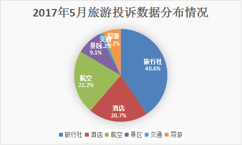 據(jù)平臺(tái)統(tǒng)計(jì),5月涉及旅行社投訴最多,占比為40.6%,其次為航空投訴(22.2%)、酒店投訴(20.7%)、景區(qū)投訴(9.1%),導(dǎo)游投訴(6.2%)和交通投訴各占(1.2%)。涉及旅行社的投訴主要提及了導(dǎo)游強(qiáng)制購(gòu)物、商家無(wú)故取消訂單、不退款等問(wèn)題。