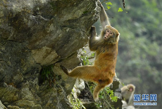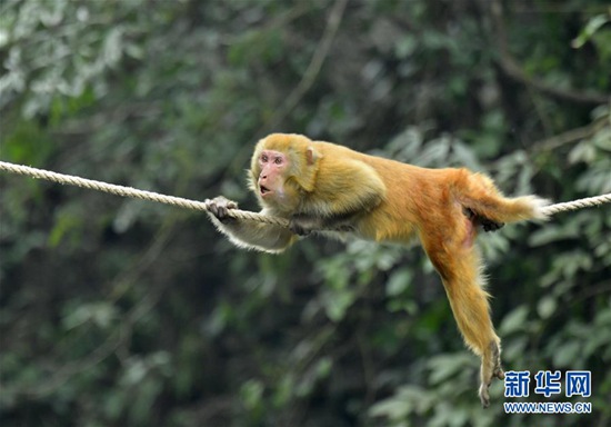12月27日,在湖北省宣恩縣獅子關(guān)村,一只獼猴沿著人們在河上拉的繩索,爬到河對岸覓取食物。