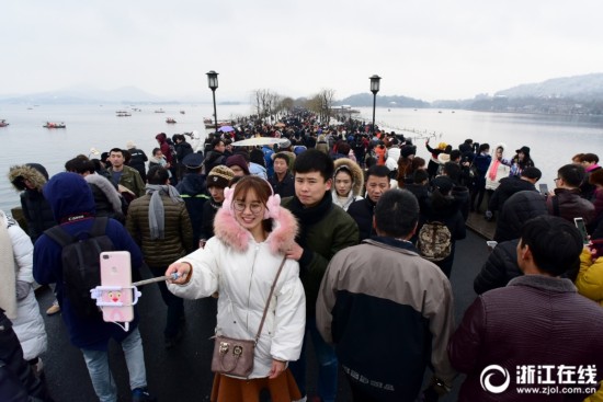 杭州:雨雪天氣收尾 斷橋火爆依舊