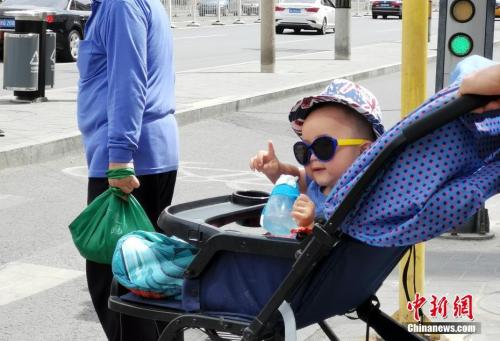 5月22日,北京街頭一名孩子在嬰兒車中戴著墨鏡。中新社記者 杜洋 攝