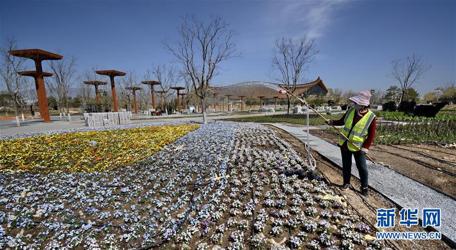 4月14日,園林工人在澆灌新種植的花卉。 近期,北京世園會(huì)園區(qū)景觀恢復(fù)工作全面啟動(dòng),將在4月28日前恢復(fù)近5萬(wàn)平米的世園標(biāo)志性花卉景觀,以及70余個(gè)室外展園。 新華社記者 李欣 攝