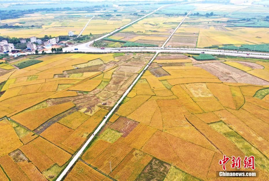金秋時節(jié),稻谷飄香。行走在廣西鄉(xiāng)村田間地頭,金黃的稻浪隨風起伏,農(nóng)民忙著收割晚稻,晾曬稻谷,臉上洋溢著豐收的喜悅。在廣西崇左市寧明縣明江鎮(zhèn)岑岳村,從空中俯瞰,金黃的稻谷好似為大地鋪上了一層黃金地毯,構成一幅幅美麗的豐收圖景。 周貽剛 攝