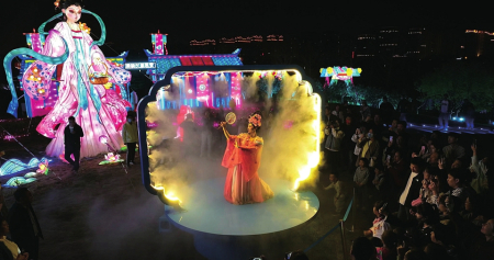在百花的傳說中,十二月令花神的傳說最令人神往。在桃花島上,梅花、杏花、桃花、牡丹、石榴、蓮花、蜀葵、桂花、菊花、木芙蓉、山茶、水仙,各路花神身著華服,在所屬花燈前翩翩起舞,燈光人影交織,盡顯浪漫?!笆ㄉ瘛泵客矸謺r段在桃花云臺,跳起如云似幻的祈福舞,笑容明媚,面若桃紅,傾倒眾人。無人機(jī)組集合成孔明燈形狀,載著每個人最虔誠的心愿緩緩升空。“十二花神”隨即走下“神臺”,出沒在各個角落,讓整個桃花島亦真亦幻。穿行其中,與“花神”擦肩而過,仿佛穿越時空,進(jìn)入神話世界。