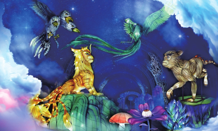 奇幻風(fēng)格的桃花路上,《山海經(jīng)》中的仙山海景和祥瑞神獸也來助陣。渾身毛發(fā)雪白的九尾狐,三頭六尾名叫鵸的鳥妖、吼聲震天名叫狌狌的犲山獸、立于昆侖山巔遙望東方的陸吾、三首六尾夜半怪笑的鵸鵌、悠然自得的麋鹿、充滿神秘色彩的青鸞、抬腿準(zhǔn)備騰云的飛馬……置身其中,仿佛斗轉(zhuǎn)星移,滄海桑田。地面的點(diǎn)點(diǎn)星光,營造出神秘夢幻的奇趣山海世界。