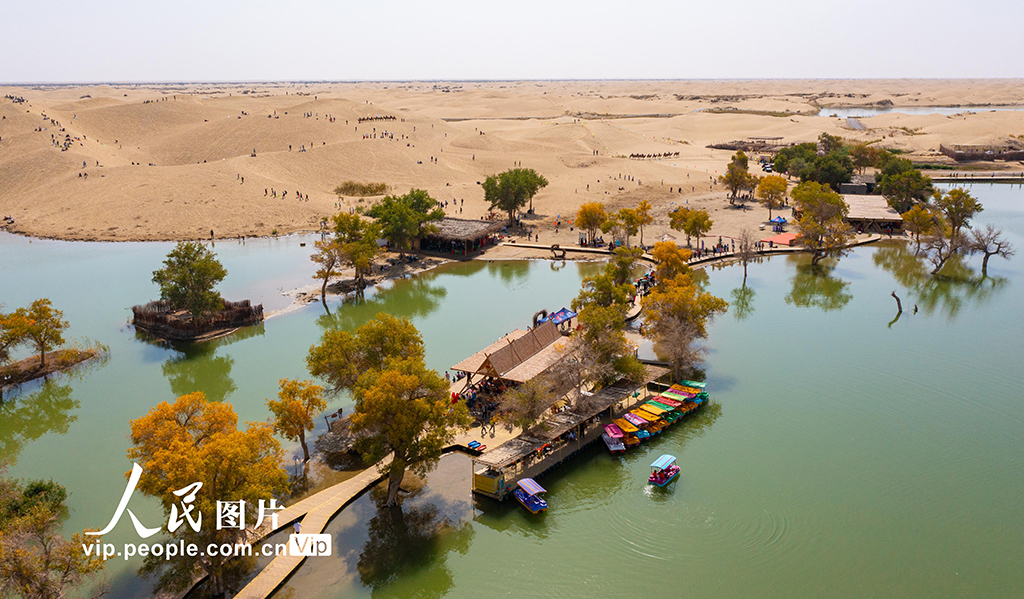 2023年10月5日,在新疆巴音郭楞蒙古自治州尉犁縣羅布人村寨景區(qū),游客們?cè)诖竽⒕G洲、湖泊的美景中暢游,駱駝騎行、沙漠越野、劃船、滑沙成為不少游客的首選。