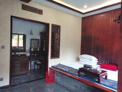 這里的房間比一般客棧寬敞許多,而且每間房都風(fēng)格迥異,比如有的床頭是充滿(mǎn)意境的書(shū)畫(huà),有的床頭是雕刻花紋的木板,有的多了古典桌椅,有的放置了茶幾,有的則多了沙發(fā)、屏風(fēng)或條幾、膽瓶……每間房都融合了寧?kù)o與古樸的元素,屋子里擺放的瓷壇和衣柜等老物件寫(xiě)滿(mǎn)歲月的痕跡。
