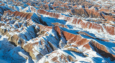 2023年12月15日,甘肅省張掖市在一場降雪之后,潔白的雪花將七彩丹霞裝扮得美輪美奐,白雪宛如輕紗浸在丹霞山上,顯得格外艷麗多彩、如夢如幻。雪后放晴,鏡頭下的甘肅張掖七彩丹霞景區(qū)被雪色覆蓋,顯現出“雪浴丹霞”景觀。殷旭攝(人民圖片網)