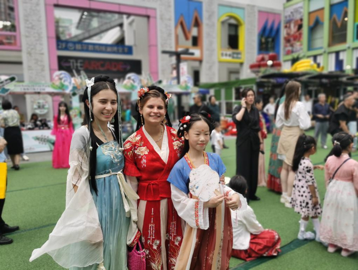 6月9日,身著中國(guó)古代服飾的外國(guó)人與中國(guó)兒童合影,參加非遺市集。新華社記者 陳愛平 攝