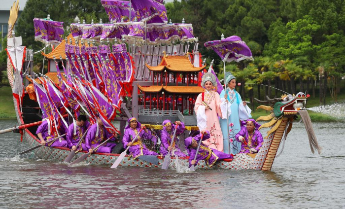 新華社上海6月10日電(記者陳愛平、許曉青)隨著立竿、出龍、點(diǎn)睛、接龍、送標(biāo)、旺盆等儀式完成,68歲的張亭源老人身著金黃色底、繡有青龍圖案的衣裳,健步登上五彩龍船。平底、昂首、翹尾的龍船在上海寶山美蘭湖面靈活行駛、快速轉(zhuǎn)彎,隊(duì)員們齊聲呼號(hào),戲曲演員立于船頭,彩旗在風(fēng)中飄揚(yáng),引得現(xiàn)場(chǎng)觀眾連連叫好。