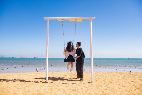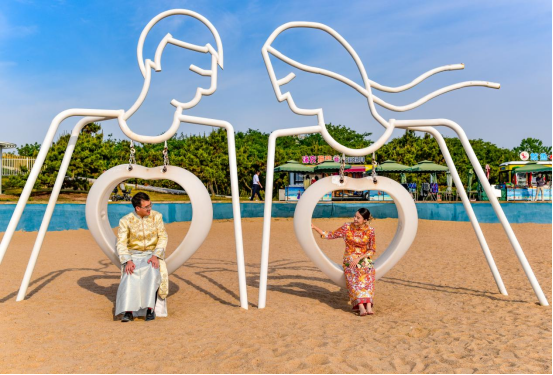 沙灘上的網(wǎng)紅打卡點(diǎn)成為拍攝婚紗照的熱門地。新華網(wǎng)發(fā)(葉連俊 攝)
