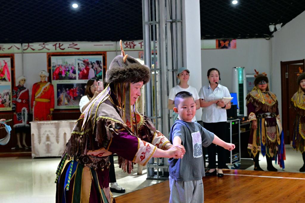 在展示館二樓活態(tài)展示區(qū),赫哲族演員頭戴鹿角帽,身穿民族服裝,跳起熱烈的“溫吉尼”舞蹈,為前來參觀的游客帶來一場(chǎng)神秘又震撼的視聽盛宴。表演結(jié)束后,游客還可以走上舞臺(tái),和演員們學(xué)習(xí)薩滿舞的舞蹈動(dòng)作,體驗(yàn)赫哲族古老的文化。