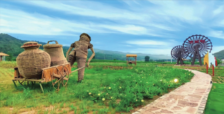 游走村內(nèi),瀟河源文化主題公園里有不少新穎物件:風(fēng)動的鐵藝風(fēng)車,像向日葵一般對著太陽開合;可以鍛煉用的水槍,需要用力向下壓幾下才能噴出很遠的水,用來澆灌花叢;還有會唱歌的“石頭”、用木條編制成的敲鑼大兔子……村內(nèi)樹木叢生,百草豐茂,綠葉水光交織,讓人心曠神怡,流連忘返。