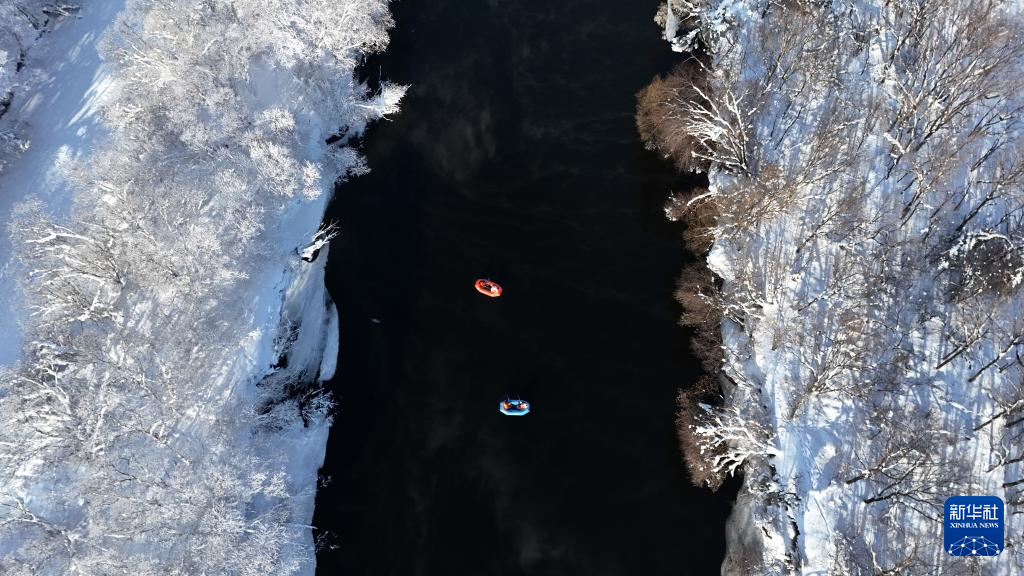 12月30日,在五大連池市山口湖景區(qū),游客體驗漂流項目(無人機照片)。