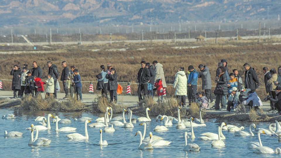 1月12日,人們?cè)谶\(yùn)城鹽湖近距離觀賞野生大天鵝。入冬以來(lái),運(yùn)城的千年鹽湖迎來(lái)一群特殊“訪客”,一大批天鵝在此棲息越冬,鹽湖搖身一變成了“天鵝湖”,與周邊的秀美山色相映成趣,構(gòu)成一幅絕美生態(tài)畫卷,讓千年鹽湖煥發(fā)出別樣生機(jī)。 劉寶成攝 (責(zé)任編輯:梁艷) |