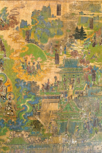 但巖山寺金代壁畫有確切年代,是御前承應(yīng)畫匠王逵用10年時(shí)間才完成這一煌煌巨制。800多年前,王逵面對四壁,決然舍棄慣常的連環(huán)畫形式,大膽?yīng)殑?chuàng),采用滿幅構(gòu)圖形式,以一組繁雜的宮廷建筑為中心,配以各種故事情節(jié)畫面,然后用山水、樹石、云嵐連結(jié),細(xì)部真實(shí),透視準(zhǔn)確,遠(yuǎn)看儼然一幅氣勢磅礴的大型山水畫,近瞧卻又章回分明。壁畫上就有多處使用瀝粉堆金裝飾,顯現(xiàn)金碧輝煌、富麗非凡的效果。這樣大面積的工筆重彩畫,一絲不茍,找不到起稿與粉本痕跡,而且線條變化多樣,無一廢筆,令人驚嘆。