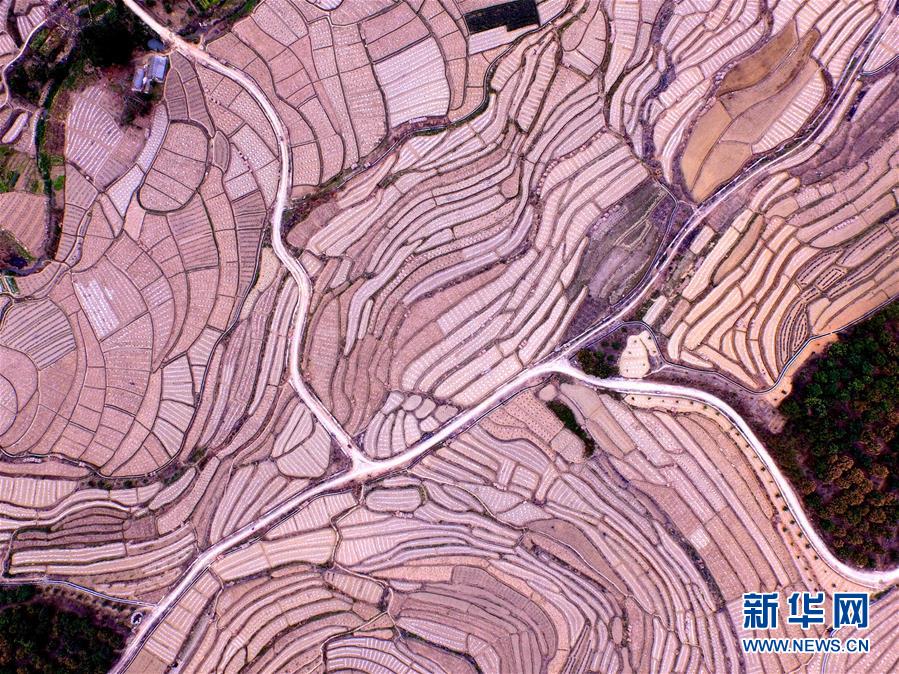 這是3月14日航拍的廣西百色市右江區(qū)永樂鎮(zhèn)西北樂村西瓜梯田景色。時下,廣西百色市右江區(qū)永樂鎮(zhèn)西北樂村進入西瓜種植護理季節(jié),地膜縱橫交錯的層層瓜田和壯族村落構(gòu)成一幅美麗的田園畫卷。百色市右江區(qū)永樂鎮(zhèn)是廣西有名的西瓜之鄉(xiāng),全鎮(zhèn)種植西瓜1.5萬畝,年產(chǎn)西瓜2.8萬噸。新華社記者 黃孝邦 攝