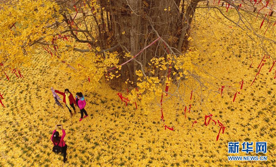 11月19日,游客在留壩縣玉皇廟鎮(zhèn)參觀千年銀杏樹。初冬時(shí)節(jié),在秦嶺深處的陜西省留壩縣玉皇廟鎮(zhèn)石窯壩村,一棵千年古銀杏樹的落葉宛如金色地毯,甚為壯觀。據(jù)當(dāng)?shù)亓謽I(yè)部門介紹,該樹胸徑為4.45米,現(xiàn)有高度29米。新華社記者 陶明 攝