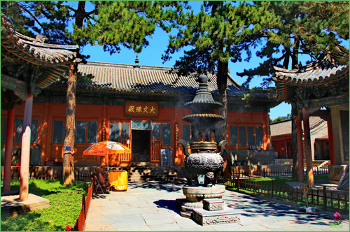 顯通寺的大雄寶殿為舉行佛事活動(dòng)主要場(chǎng)所,是顯通寺的第三重大殿,殿內(nèi)供著三尊佛像:中是釋迦牟尼佛,西是阿彌陀佛,東是藥師佛;兩旁有十八羅漢像背后有觀音、文殊、普賢三尊菩薩像。觀音殿殿內(nèi),中間供著觀音菩薩像,左右供著文殊和普賢菩薩像。大文殊殿,是顯通寺的第二重大殿。大文殊殿內(nèi),供著七尊文殊菩薩像:正中的為大智文殊;前面的五位,從左至右,依次為西臺(tái)獅子文殊,南臺(tái)智慧文殊,中臺(tái)孺者文殊,北臺(tái)無垢文殊,東臺(tái)聰明文殊;大智文殊后面是甘露文殊。文殊像前有護(hù)法神韋馱像,兩側(cè)有十八羅漢像。