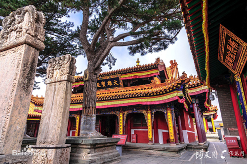 全寺占地四十五畝,順山就勢而筑殿宇,布局嚴(yán)謹(jǐn)。寺前有石階一百零八級。山門內(nèi)有天王殿、鐘鼓樓、大雄寶殿等建筑。各殿均用三彩琉璃瓦覆蓋。又,寺內(nèi)有康熙御碑,方座螭首,矗立在前院;乾隆御碑在東禪院碑亭內(nèi),以方形巨石雕成,高六公尺,每面寬一公尺,上刻漢、滿、蒙、藏四種文字。