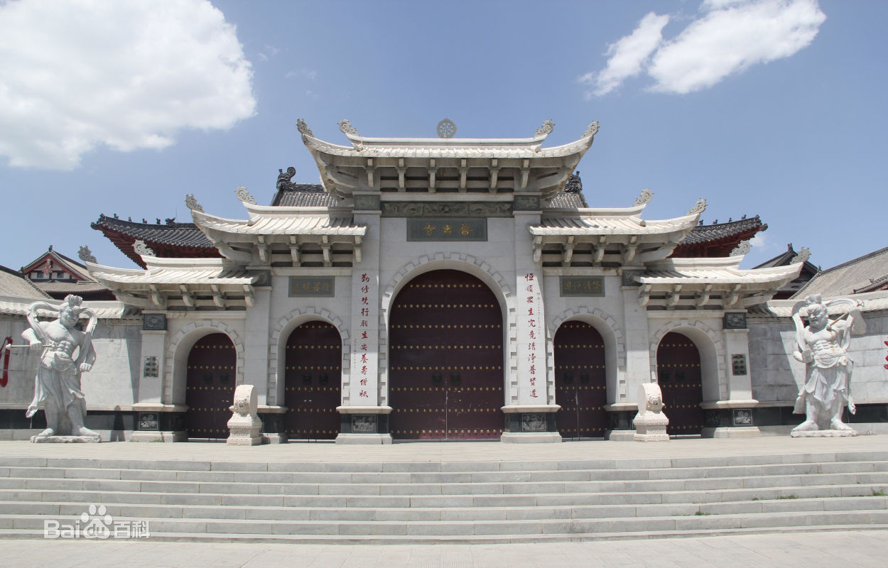 新建的普壽寺坐北面南,占地面積一萬九千九百八十八平方米。寺內(nèi)分為東西兩院,東院偌大,前面為非常秀麗的漢白玉牌樓,下層為青磚砌筑,上層為木構(gòu)建筑,單檐五脊頂,四出廊。山門正面額上嵌一書有「普壽寺」三字的石匾。西院一進四個小四合院,第一為天王殿院,正面為天王殿,三開間,單檐歇山頂。殿內(nèi)正中置木龕,供石刻彌勒佛,背面供彩塑韋馱將軍,兩山間彩塑四大天王。天王殿兩側(cè)為鐘鼓二樓。東西樓二十四間,東配樓為客堂,墻上掛著名人字畫,其中有原中國佛教協(xié)會會長趙樸初書寫的一副對聯(lián)「恒順眾生究竟清涼普賢道,勤修梵行愿生安養(yǎng)壽僧祗」。
