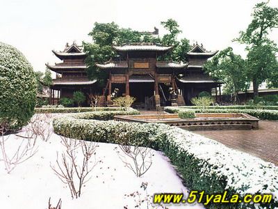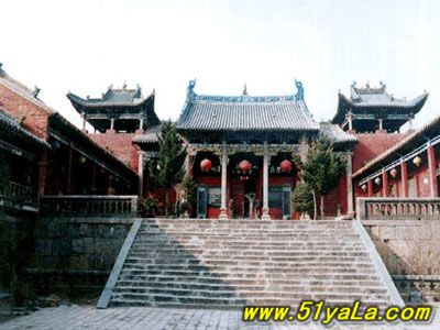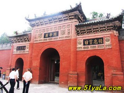 前行有午門.是一座面闊五間,單檐廡殿頂、石雕回廊的廳式建筑。周圍有石欄桿,欄板正反兩面浮雕各類圖案、人物144幅,洋洋大觀,頗有童趣。廳內南有周倉、廖化畫像,軒昂威武。北面左右兩側,彩繪著關羽戎馬一生的主要經歷,起于桃園三結義,止于水淹七軍,只是沒有走麥城這個情節(jié),在全國關廟壁畫中都按此進行,據說這是因忌諱關羽自高自大而被殺,終于造成蜀國的覆滅而隱去的。穿過午門,經“山海鐘靈”坊、御書樓,便是關帝廟主體建筑崇寧殿。