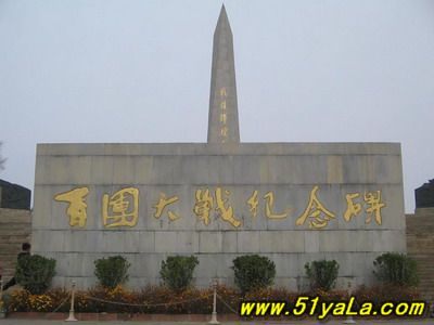 “百團(tuán)大戰(zhàn)紀(jì)念碑”座北朝南,由主碑、三座副碑、一座大型圓雕、兩座題字碑、四個(gè)烽火臺和長 227米蜿蜒起伏的長城組成,于1987年6月30日建成。