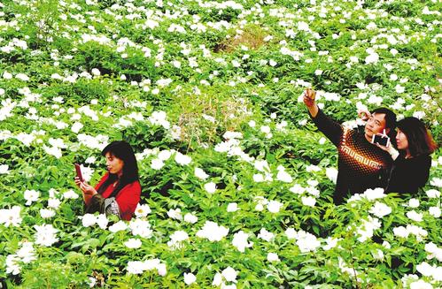 4月11日,在垣曲縣古城鎮(zhèn)允嶺村的牡丹園,游人正在賞花自拍。該村地處黃河水庫(kù)邊,近年來圍繞鄉(xiāng)村游發(fā)展觀光農(nóng)業(yè),先后建起了百畝牡丹基地、百畝油蔬基地和千畝石榴基地,每到盛花期,吸引四面八方的游客賞花觀景。(崔松良 攝)