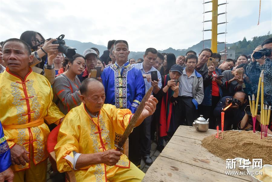 農(nóng)歷十月十五前后,福建西部武平縣各山村陸續(xù)進(jìn)入農(nóng)閑時(shí)節(jié)。按照當(dāng)?shù)仫L(fēng)俗,不同村子各自擇日舉辦民間活動(dòng),其中較有代表性的就是“上刀山”絕技?!吧系渡健苯^技在閩西山村流傳已有數(shù)百年歷史,表演者需光腳順著磨得鋒利閃亮的36把鋼刀,攀登至8米高的杉木柱子頂部,接受長(zhǎng)者祝福,祈求風(fēng)調(diào)雨順、五谷豐登。新華社記者 宋為偉 攝