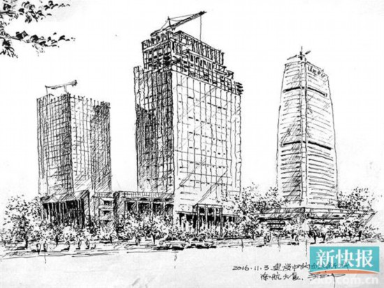 “以前工作日需要上班,我就利用周末在街巷間走動(dòng),看到地標(biāo)建筑就開始畫。遇到正在施工的高樓,我就計(jì)算著日子,到高樓即將封頂?shù)臅r(shí)候,我就帶上紙筆到施工現(xiàn)場(chǎng)畫畫?!眳橇⒅薪榻B。