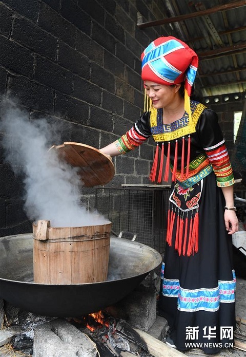 3月25日,在廣西上林縣巷賢鎮(zhèn),一名壯族女子在蒸制五色糯米飯。新華社記者 陸波岸 攝