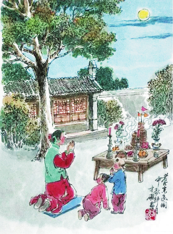 “中秋月。月到中秋偏皎潔?!辟p月是中秋節(jié)的重要習(xí)俗,我國(guó)民間的中秋賞月活動(dòng)約始于魏晉時(shí)期,盛于唐朝,當(dāng)時(shí)許多名篇佳作中都有詠月的詩(shī)句。北宋時(shí)期,以賞月活動(dòng)為中心的中秋節(jié)已成為普遍的民俗節(jié)日,然而與唐代不同的是,宋代關(guān)于賞月的作品多是感物傷懷,以陰晴圓缺喻人情世態(tài)。宋代的中秋夜是不眠之夜,夜市通宵營(yíng)業(yè),游人絡(luò)繹不絕,《東京夢(mèng)華錄》中載:“中秋節(jié)前,諸店皆賣新酒,貴家結(jié)飾臺(tái)榭,民家爭(zhēng)占酒樓玩月,笙歌遠(yuǎn)聞千里,嬉戲連坐至?xí)??!币恍┑胤缴踔亮鱾鳌爸星镆乖酵硭介L(zhǎng)壽”的說法,于是有了守夜的習(xí)俗。守夜時(shí),家里長(zhǎng)輩通常會(huì)給小孩講關(guān)于月亮的故事,如嫦娥奔月、吳剛伐桂等,孩子們個(gè)個(gè)聽得津津有味。