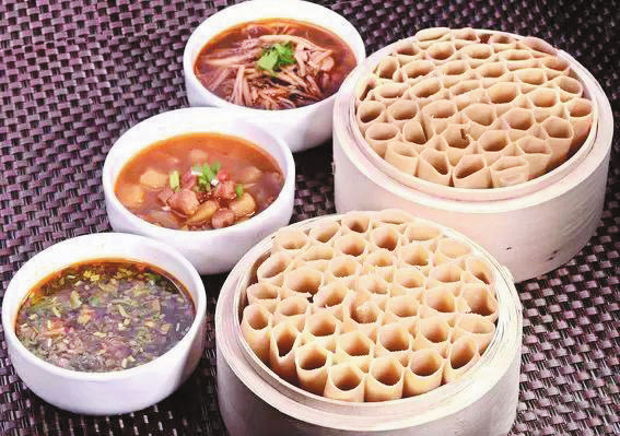 莜面栲栳栳。莜面栲栳栳又叫“莜面窩窩”,是過去老百姓農忙時節(jié)為省事普遍愛做的一種飯食。它工藝講究,成形美觀,口感筋道,再加上“羊肉臊子臺蘑湯”,真可謂“一家吃著十家香”,難怪就連康熙皇帝朝拜五臺山時,也以品此為人生快事。其做法是:和面時加以燒開的水,用筷子攪拌成面絮,趁熱將其揉成光滑的面團;取一小塊放在光滑的面板上,用手掌使巧勁一搓,然后撕起來往食指上繞,卷成中間空的小卷,豎在蒸籠里;最后放在沸水鍋上蒸10分鐘即熟,蒸時要注意火候,火候不到會不熟,蒸得過火則軟癱立不起來,吃時味欠色減。