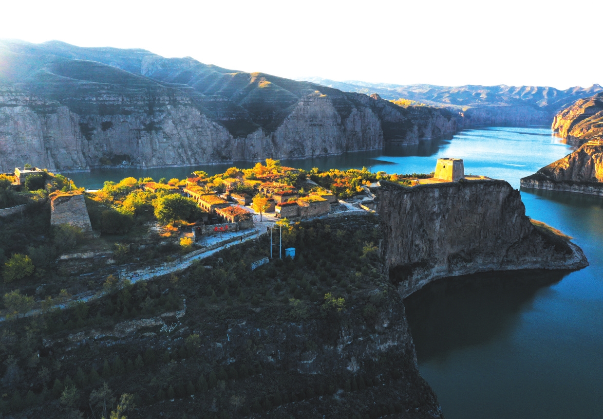 2015年的夏天,我又一次來(lái)到老牛灣,105米高的萬(wàn)家寨水電大壩飛跨晉蒙,黃河水在絕壁中安靜了、變綠了。老牛灣村前的小河倒灌進(jìn)了黃河水,一個(gè)灣成了兩個(gè)灣,團(tuán)團(tuán)地圍住了山村,又好似老牛彎出了兩個(gè)碧綠的牛角,太漂亮了。老鄉(xiāng)們說(shuō):“有企業(yè)來(lái)開發(fā)道路、景區(qū)了,也有北京游客開車來(lái)游玩了,拍照的多,照幾張相就走了?!蓖侨匀粴埰频拈T樓和石板院房,我不知該說(shuō)什么、能說(shuō)什么。