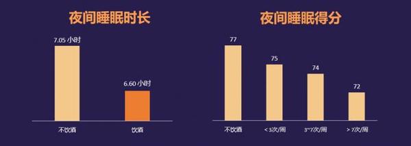 飲酒人群比不飲酒人群平均每晚少睡27分鐘。飲酒頻次越高,睡眠質(zhì)量越低,每周飲酒大于7次的人群比從不飲酒人群,睡眠得分低4分。