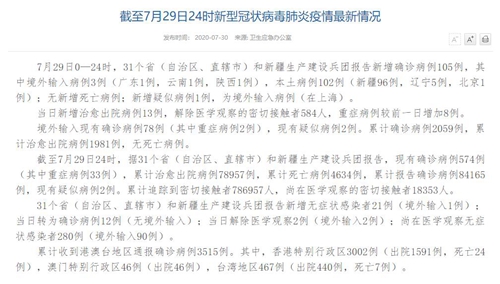 人民網(wǎng)北京7月30日電(董童)國家衛(wèi)生健康委于今日在官網(wǎng)發(fā)布的《截至7月29日24時新型冠狀病毒肺炎疫情最新情況》(以下簡稱“情況”)提出,7月29日0—24時,31個省(自治區(qū)、直轄市)和新疆生產(chǎn)建設(shè)兵團報告新增確診病例105例,其中境外輸入病例3例(廣東1例,云南1例,陜西1例),本土病例102例(新疆96例,遼寧5例,北京1例);無新增死亡病例;新增疑似病例1例,為境外輸入病例(在上海)。當日新增治愈出院病例13例,解除醫(yī)學觀察的密切接觸者584人,重癥病例較前一日增加8例。