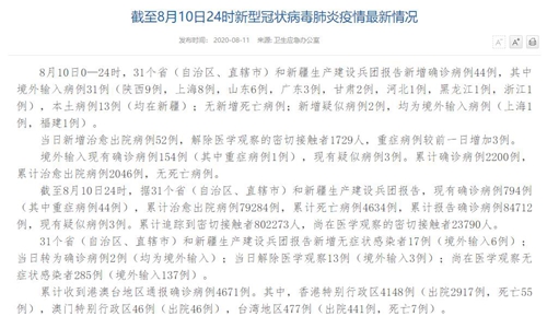 人民網(wǎng)北京8月11日電(董童)國家衛(wèi)生健康于今日在官網(wǎng)發(fā)布的《截至8月10日24時(shí)新型冠狀病毒肺炎疫情最新情況》(以下簡稱“情況”)提出,8月10日0—24時(shí),31個?。ㄗ灾螀^(qū)、直轄市)和新疆生產(chǎn)建設(shè)兵團(tuán)報(bào)告新增確診病例44例,其中境外輸入病例31例(陜西9例,上海8例,山東6例,廣東3例,甘肅2例,河北1例,黑龍江1例,浙江1例),本土病例13例(均在新疆);無新增死亡病例;新增疑似病例2例,均為境外輸入病例(上海1例,福建1例)。當(dāng)日新增治愈出院病例52例,解除醫(yī)學(xué)觀察的密切接觸者1729人,重癥病例較前一日增加3例。