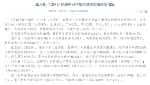 情況顯示,截至8月12日24時,據(jù)31個省(自治區(qū)、直轄市)和新疆生產(chǎn)建設(shè)兵團(tuán)報告,現(xiàn)有確診病例724例(其中重癥病例41例),累計治愈出院病例79398例,累計死亡病例4634例,累計報告確診病例84756例,現(xiàn)有疑似病例4例。累計追蹤到密切接觸者803651人,尚在醫(yī)學(xué)觀察的密切接觸者22498人。