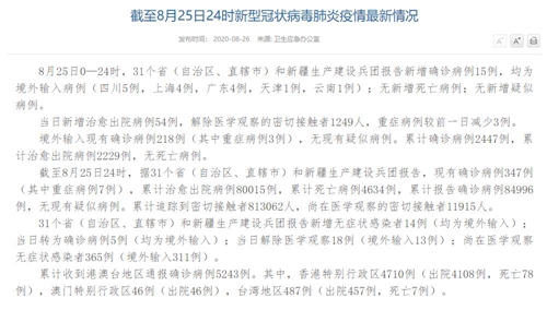 情況顯示,截至8月25日24時,據31個?。ㄗ灾螀^(qū)、直轄市)和新疆生產建設兵團報告,現(xiàn)有確診病例347例(其中重癥病例7例),累計治愈出院病例80015例,累計死亡病例4634例,累計報告確診病例84996例,無現(xiàn)有疑似病例。累計追蹤到密切接觸者813062人,尚在醫(yī)學觀察的密切接觸者11915人。