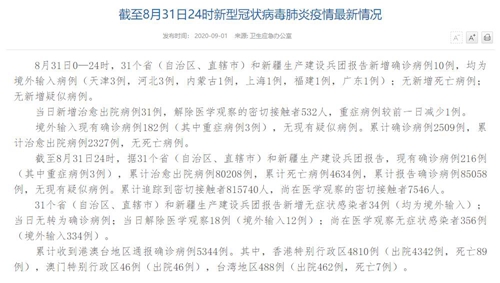 截至8月31日24時(shí),據(jù)31個?。ㄗ灾螀^(qū)、直轄市)和新疆生產(chǎn)建設(shè)兵團(tuán)報(bào)告,現(xiàn)有確診病例216例(其中重癥病例3例),累計(jì)治愈出院病例80208例,累計(jì)死亡病例4634例,累計(jì)報(bào)告確診病例85058例,無現(xiàn)有疑似病例。累計(jì)追蹤到密切接觸者815740人,尚在醫(yī)學(xué)觀察的密切接觸者7546人。