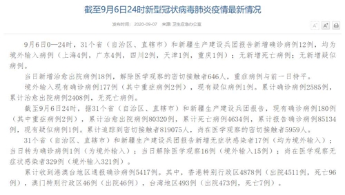 情況顯示,截至9月6日24時(shí),據(jù)31個(gè)?。ㄗ灾螀^(qū)、直轄市)和新疆生產(chǎn)建設(shè)兵團(tuán)報(bào)告,現(xiàn)有確診病例180例(其中重癥病例2例),累計(jì)治愈出院病例80320例,累計(jì)死亡病例4634例,累計(jì)報(bào)告確診病例85134例,現(xiàn)有疑似病例1例。累計(jì)追蹤到密切接觸者819075人,尚在醫(yī)學(xué)觀察的密切接觸者5959人。