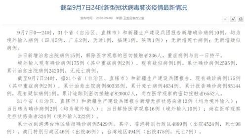 情況顯示,截至9月7日24時(shí),據(jù)31個(gè)?。ㄗ灾螀^(qū)、直轄市)和新疆生產(chǎn)建設(shè)兵團(tuán)報(bào)告,現(xiàn)有確診病例175例(其中重癥病例2例),累計(jì)治愈出院病例80335例,累計(jì)死亡病例4634例,累計(jì)報(bào)告確診病例85144例,現(xiàn)有疑似病例1例。累計(jì)追蹤到密切接觸者820007人,尚在醫(yī)學(xué)觀察的密切接觸者6552人。
