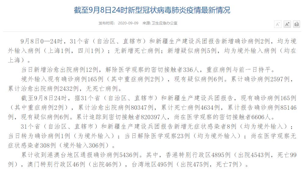 情況顯示,截至9月8日24時(shí),據(jù)31個(gè)省(自治區(qū)、直轄市)和新疆生產(chǎn)建設(shè)兵團(tuán)報(bào)告,現(xiàn)有確診病例165例(其中重癥病例2例),累計(jì)治愈出院病例80347例,累計(jì)死亡病例4634例,累計(jì)報(bào)告確診病例85146例,現(xiàn)有疑似病例6例。累計(jì)追蹤到密切接觸者820397人,尚在醫(yī)學(xué)觀察的密切接觸者6606人。