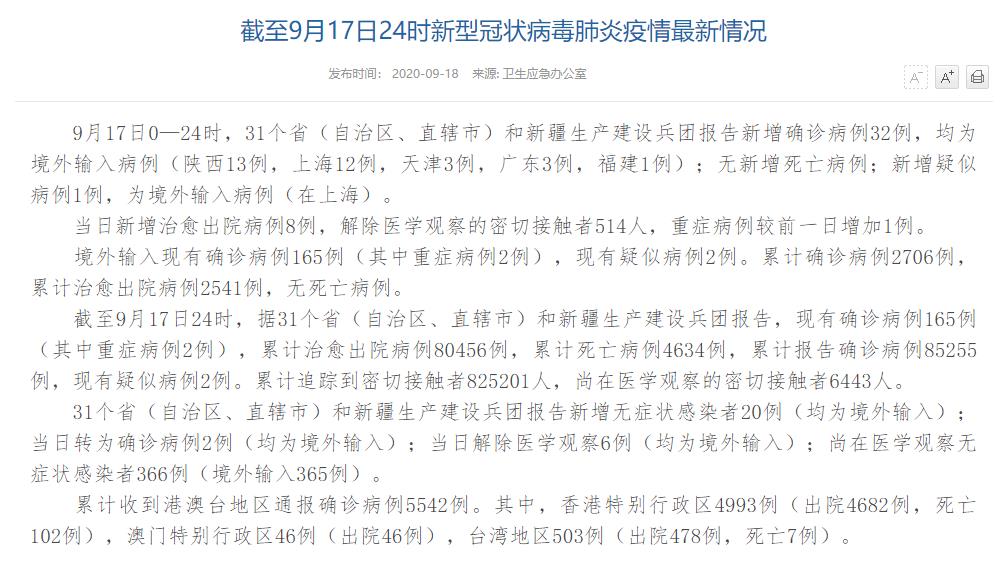 | 國家衛(wèi)健委:9月17日新增確診病例32例 均為境外輸入病例 |