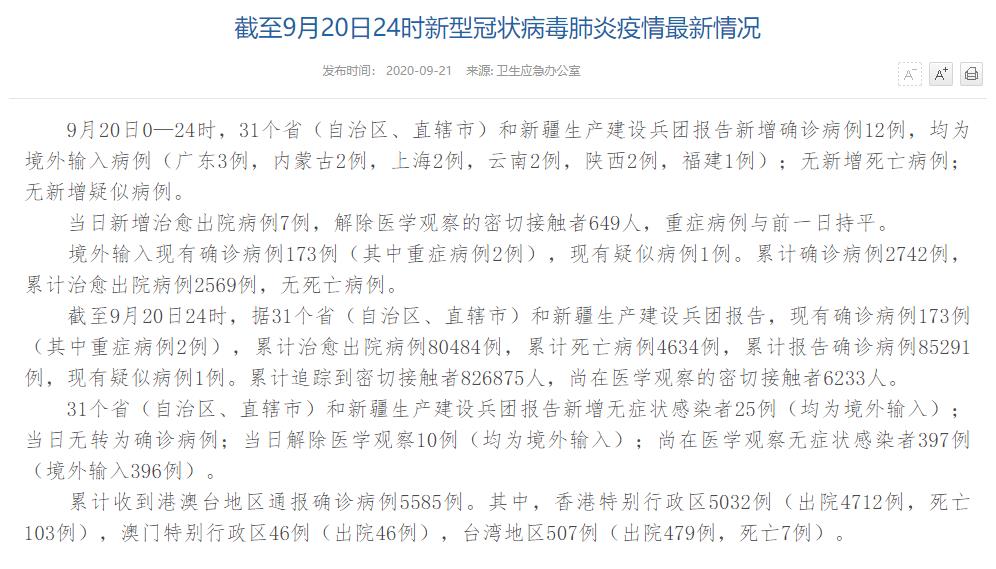 人民網(wǎng)北京9月21日電(董童)國家衛(wèi)生健康委于今日在官網(wǎng)發(fā)布的《截至9月20日24時(shí)新型冠狀病毒肺炎疫情最新情況》(以下簡稱“情況”)提出,9月20日0—24時(shí),31個(gè)省(自治區(qū)、直轄市)和新疆生產(chǎn)建設(shè)兵團(tuán)報(bào)告新增確診病例12例,均為境外輸入病例(廣東3例,內(nèi)蒙古2例,上海2例,云南2例,陜西2例,福建1例);無新增死亡病例;無新增疑似病例。當(dāng)日新增治愈出院病例7例,解除醫(yī)學(xué)觀察的密切接觸者649人,重癥病例與前一日持平。